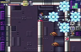 Diffusion Missiles (ディフュージョンミサイル Difyūjon Misairu) are a special type of chargeable Missile created by the Galactic Federation. They further increase the damage of Missiles to 45, and when fully charged, Missile impacts release four snowflakes that swirl outward spanning the entire screen; freezing enemies, opening nearby doors, and destroying both Fake Blocks and Missile Blocks. Their only appearance is in Metroid Fusion, and they are the fifteenth upgrade collected by Samus.