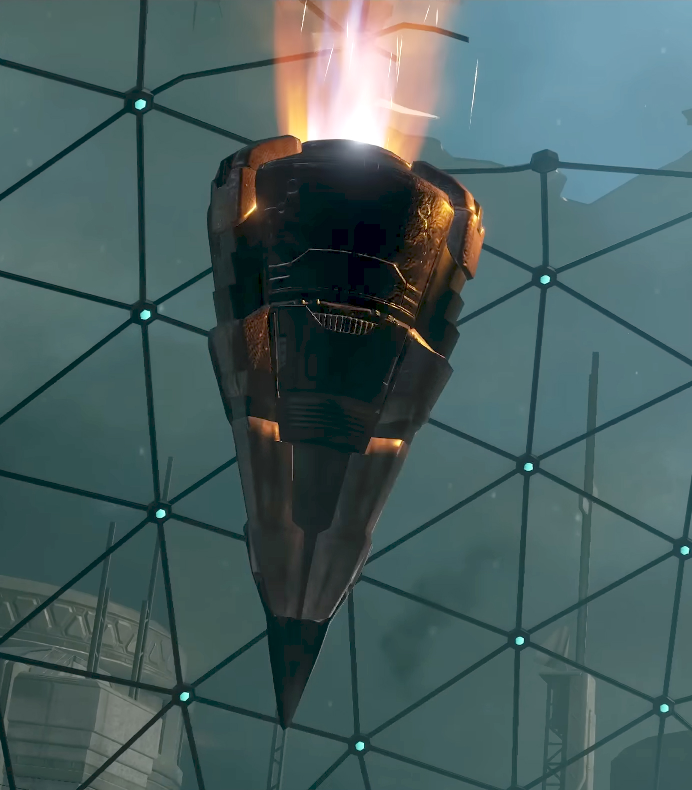 While in flight, Dive Spikes are entirely conical in shape. Upon impact, their lower portion is driven into the ground, while the upper portion unfolds outwards to enable the Dive Spike's occupants to disembark.