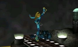 Samus Aran's Downward Throw is the Beam Slam[3]. She violently picks up her foe with her Grapple Beam, slings them over her head, and slams them into the ground with a set knockback, dealing 6% base damage. Dark Samus's Downward Throw is identical.