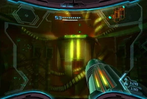 This room contains metal platforms that lead up to the end of the room. Grab Ledges allow Samus to jump to the normally unreachable ledges and pull herself up. Many Phazon growths can be seen on the walls and platforms. Underneath the room is a sheer drop. Between the platforms high frequency Mining Cannons are fired at intervals. These beams cut up the Phazon deposits at the bottom of the shaft, and a tractor beam sucks in the produce through a transparent tube that leads up the right of the room to be processed. To the top left of the room is another platform that has several Space Pirate Crates and a Space Pirate Data entry.