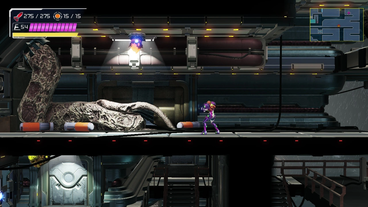 While Samus hits the tentacle with Beams and Missiles, Drogyga will attack by releasing three swaying balls of energy. Two are always blue and can be shot for Energy Capsules and Missile Ammo, while the third is composed of fire and indestructible. The energy balls fall to the floor and disperse if they are not shot or touched by Samus. It can also unleash four additional tentacles from its sides, pressing two into the walls on either side and extending two more on whichever side of it Samus is on. It will whip them at her one-by-one, but they can be jumped over.