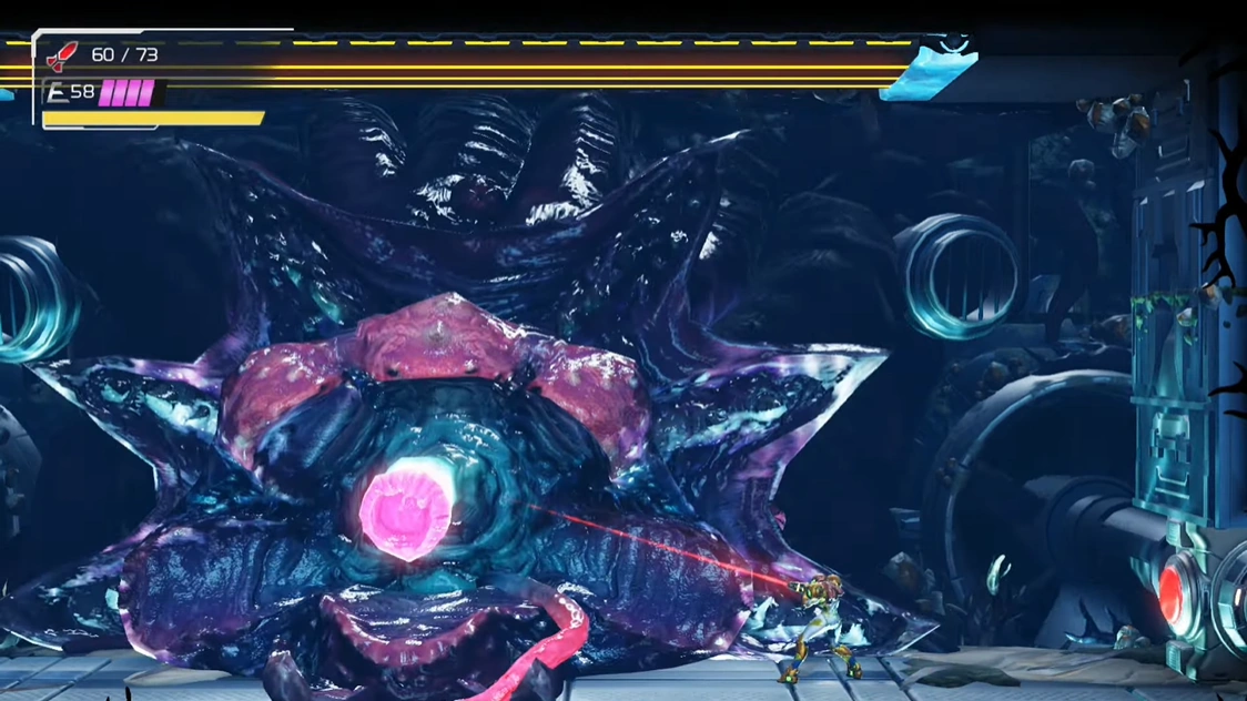 Once the upper tentacle has sustained enough damage, it will retract, restoring power to the zipline as Drogyga collapses briefly. As this happens, a Shootactivator to Samus's left activates with a red light. She must fire a Missile or charged shot to activate it, partially draining the water filling the room. Samus can then grapple to the zipline's blue magnetic strip, which carries her to Drogyga's other side. From there, she can fire at another red-lit Shootactivator to completely drain the room's water. Without water, Drogyga opens its maw, allowing Samus to attack its pistil. It will eventually retaliate by thrusting a tentacle at Samus, which she can jump over or parry with a Melee Counter; the latter does not lead into a Grab Sequence, but provides Samus some more time to hit Drogyga's weak point, whilst changing the camera angle to give more excitement