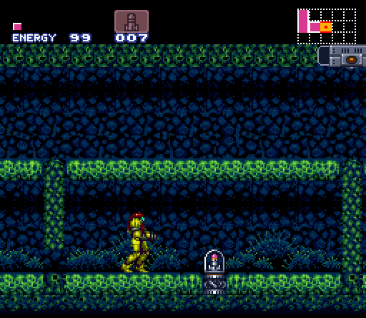 This room is the first to be found on the left of the "Green Brinstar Main Shaft". It is a horizontal corridor with a long green bridge stretching to the end of the room. The bridge is partially made of Pit Blocks, which will crumble if Samus does not dash over them. Even then, there are three shutters that will close in front of her as she runs. Under normal circumstances, the Speed Booster is required to run fast enough to beat the shutters. The door at the end of the Early Supers Room has a Super Missile Tank, which if obtained early negates the need to fight Spore Spawn.