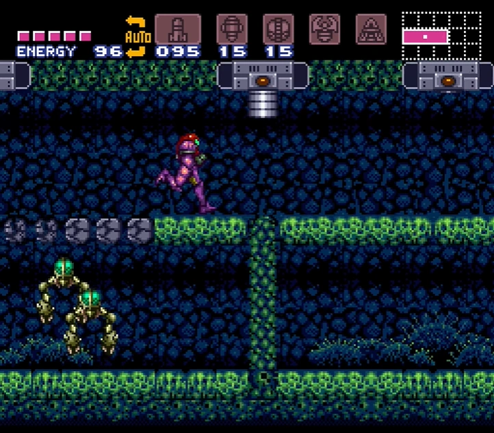 Directly to the right of the last shutter in the ceiling is a pair of Fake Blocks, which Samus can shoot to access an artificial upper walkway. This area is infested with enemies, but has a Super Missile Tank at its end. After collecting it, Samus can step onto its pedestal to be dropped back to the entrance below, as the pedestal is a Pit Block.