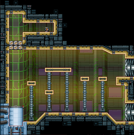 The room is square in shape, and features entirely metal architecture with a yellow and green color scheme. It is located outside one of the habitat areas modeled after SR388, with the corrupted atmospheric stabilizers. The back wall features a circuitry-like pattern, with multiple purple and red-colored panels visible in the background. Five platforms, one of which is elongated, are held in the air, supported by large pillars based in the floor. The floor itself has a slope on either end, which enables a continued Shinespark.