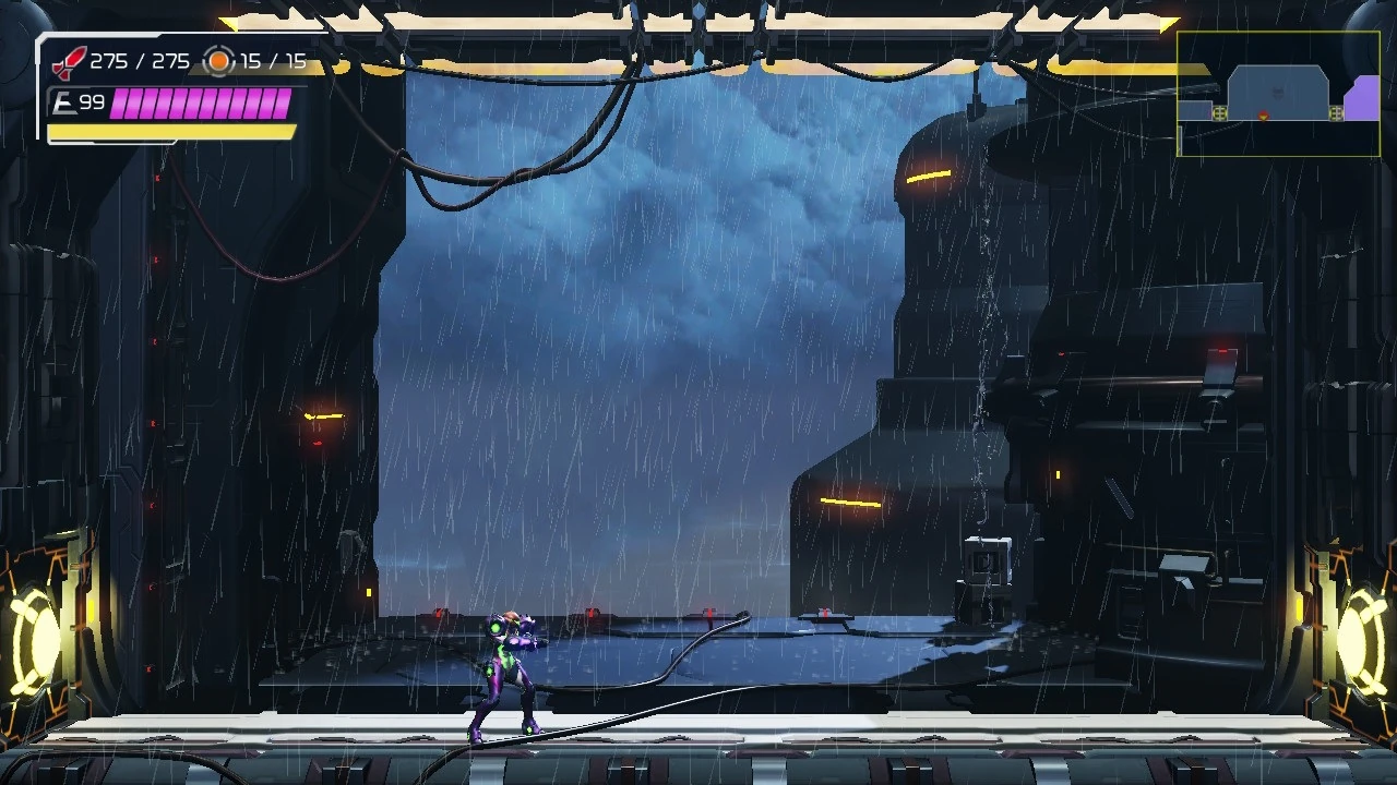This is a contained room with a walkway outside the Hanubia facility. It is passed through while Samus is exploring the area in search of Itorash, where Raven Beak is located. Since it is outside, the room is exposed to the rainstorm, with the ceiling of one building in the background having noticeable runoff from its roof. Two crates are present beside this building, and lightning strikes are visible in the background as well. A ceiling overhead prevents most of the rain from landing on the playable plane. Several loose cables hang from the ceiling, shaking because of the wind. Three cables are also present on the floor, which do not move. Part of the ceiling consists of elongated, yellow lights.