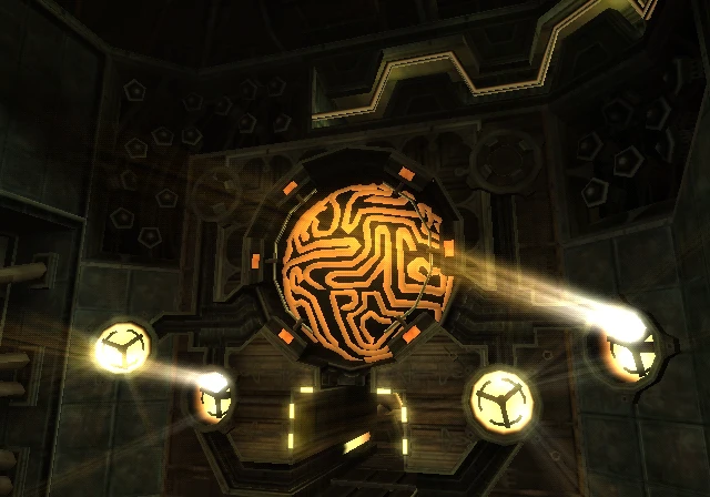 The nodes connect to the grid through channels in the wall that coalesce into a trio. When she has activated the nodes, they will light up and spin in place, the grid will flash, and a small entry lock at its base will open. Samus can enter this in Morph Ball form to reach the lower part of the Powerworks.