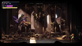 This room is tucked into a small corner on the eastern side of Ferenia, only accessible via a remote shaft. It features four open windows in the background, with buttresses, draped flags with the Mawkin symbol, and five large Chozo Soldier statues in multiple stances. The background wall appears to be round; hence the "gazebo" designation. The flags are affected by the wind in the background, which shows them to be partially torn at their ends.