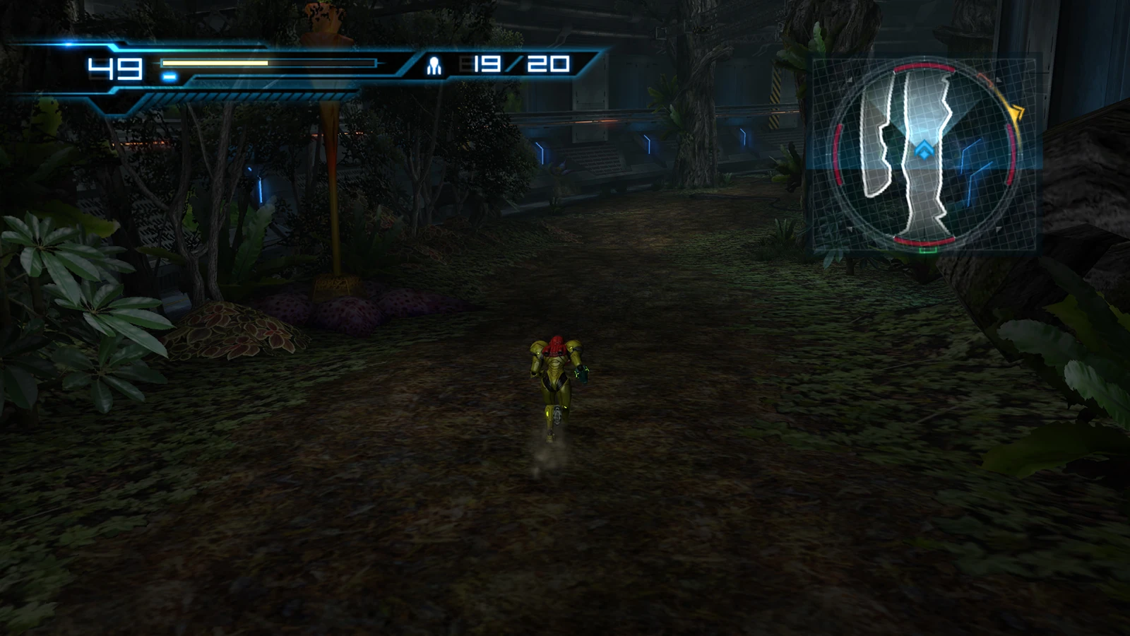 The room is quite large and predominately environmental in composition, although it features a Sliding platform, metal track off to the left, and network of Morph Ball tunnels. There are several trees in this room of varying species, though it is unknown if they are illusions as with some other elements of the Biosphere and Sector 3 / Pyrosphere. The trees create a division in the middle of the room, forcing Samus to go around if she wishes to explore the other end.