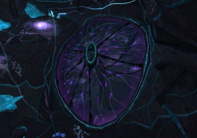 The exposed membrane is a large nest found on the wall of the first half of the Metroid Cavern on Phaaze. Its scan states that it is a small section of a nest containing hundreds of juvenile Metroids. The membrane is purple in color and has a black, oval-shaped "core" with a turquoise border, which is surrounded by vein-like lines. Phazon Metroids will spawn infinitely from this hive; the mentioned core will glow with a turquoise aura when spawning Metroids. Samus cannot destroy the hive or access its interior. Scores of Phazon Metroids can be seen within the membrane, stretching far into the background.