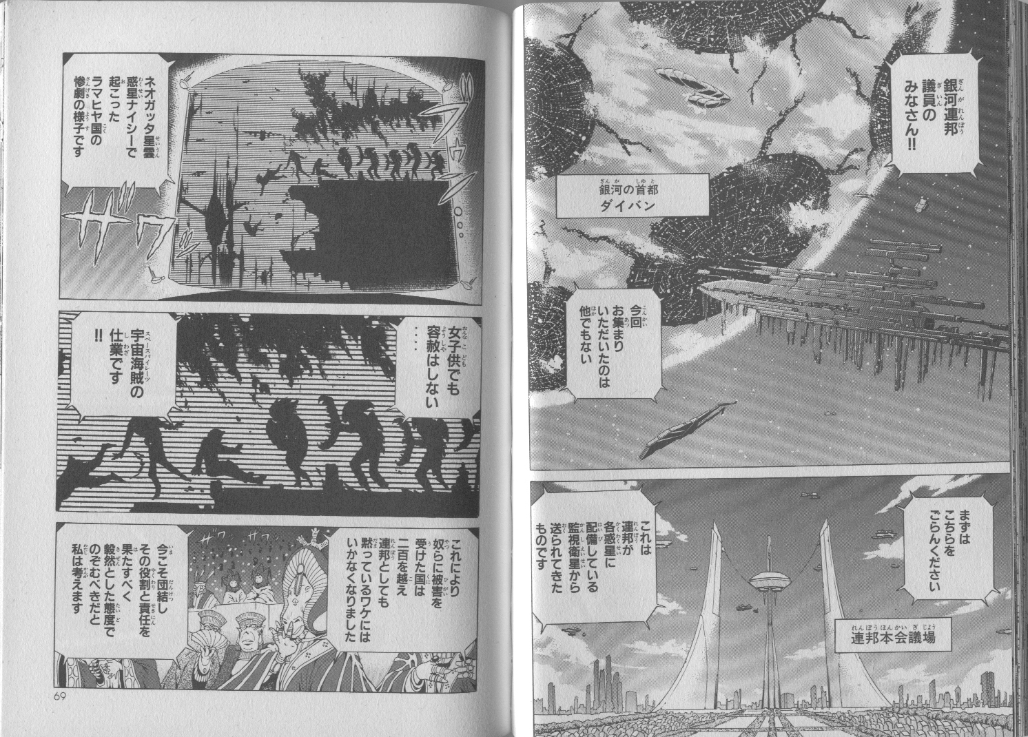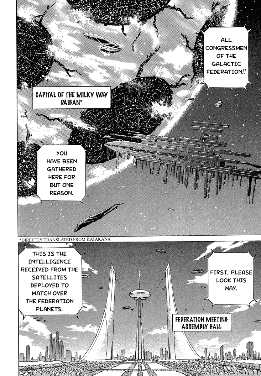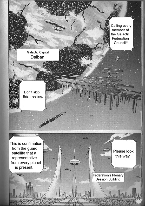 The Federation Meeting Assembly Hall (連邦本会議場)[1], also translated as Federation's Plenary Session Building[2] (or referred to as the Federation Meeting Chambers or Galactic Federation Hall) is a massive building on Daiban, the Milky Way Galaxy's capitol, from which the representatives of every planet within the Galactic Federation meet (such as Chairman Keaton, Chairman Vogl, and Old Bird) and discuss current problems, such as how to deal with the growing Space Pirate threat. It is comprised of a vast majority of different species ranging from every corner of Federation space.