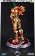 First 4 Figure's first Metroid statue to be put into production was Samus's classic Varia Suit as it appeared in Metroid Prime. It was limited to 2,500 pieces worldwide, and was painted according to the game files with metallic paint. Samus is shown in a shooting pose, leaning back and taking aim with her Arm Cannon. The base that the figure comes with is also very detailed, representing a metal platform. It retailed for $100.00 on the First 4 Figures website, but because many have been sold out, other sites such as Amazon.com charge more for the statue.[1]