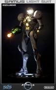 A new PVC statue based on the Metroid Prime Varia Suit was announced on October 11. Preorders will open on October 24, 2023.[6] The pose is similar to the second Varia Suit statue, in PVC form. It comes with an interchangeable hand that can either hang to Samus's side or be placed on her hip, as with the second statue. An Exclusive Edition is available, which comes with LED lights in Samus's helmet, Arm Cannon and green accents. Additional accessories include "a premium deluxe box, limited edition numbering, authentication card, rechargeable battery, and USB charging cable".