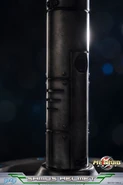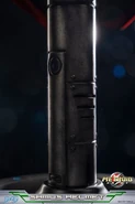 While the mold is the same as the previous Varia Suit and Gravity Suit, the inside of the statue has been completely reworked to fit 50 LED lights all over the suit that illuminates all of the "lights" on Samus' suit when a button on the base is pressed, including the Visor and Arm Cannon. It is painted to match the Phazon Suit's color scheme (with the exception of the Arm Cannon, now colored silver). It includes a mirror base, which shows off the lights, but is very heavy. Two metal connectors plug into the base from under Samus' left foot. The Arm Cannon has blue LEDs in it, allowing the lines in the Cannon to light up, and it even generates a beam of light from the inside when lit. If facing a wall, the Arm Cannon will act as a blue flashlight and create a blue circle upon the surface of the wall. An internal IC Chip has been implanted into the statue, thus when the button is pressed again and the lights turn off, they fade out slowly. The Arm Cannon fades out first, then the rest of the suit follows. The figure requires three AA batteries that are included and is limited to 1,500 pieces worldwide. The price of the statue is $224.99.[5] The pose for the statue is taken from the scene when Samus first acquires the suit.