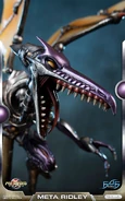 "The reconstruction of geoform 187, code-named Ridley, was recently completed. After his defeat on Zebes, Command ordered a number of metagenetic improvements for him. Though aggressive, we were able to implement these changes in a cycle. The metamorphosis was painful, but quite successful in the end. Early tests indicate a drastic increase in strength, mobility, and offensive capability. Cybernetic modules and armour plating have been added as well. We believe our creation, now called Meta Ridley, will become the mainstay of our security force, a job he will certainly relish." ― Pirate Data Logbook Entry, Metroid Prime