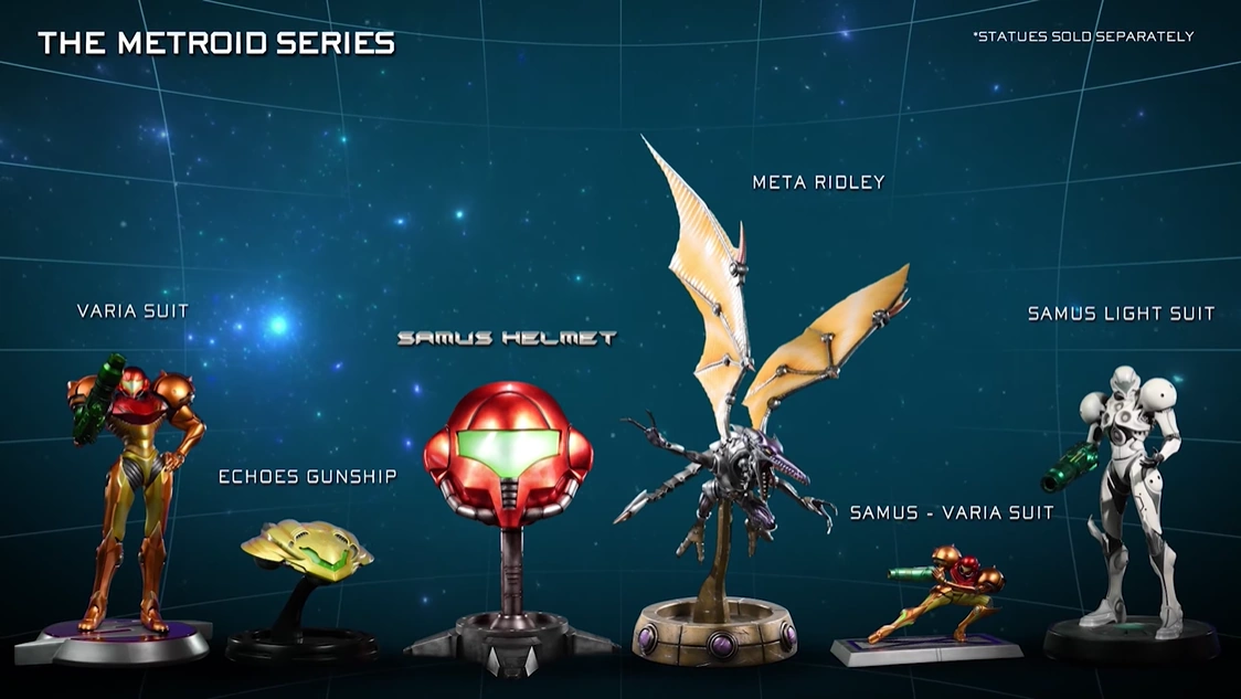 First 4 Figures have produced a number of Metroid statues, all of them being game-accurate by using in game files to recreate the designs of the characters or gunships. Each figure is produced in limited quantities.