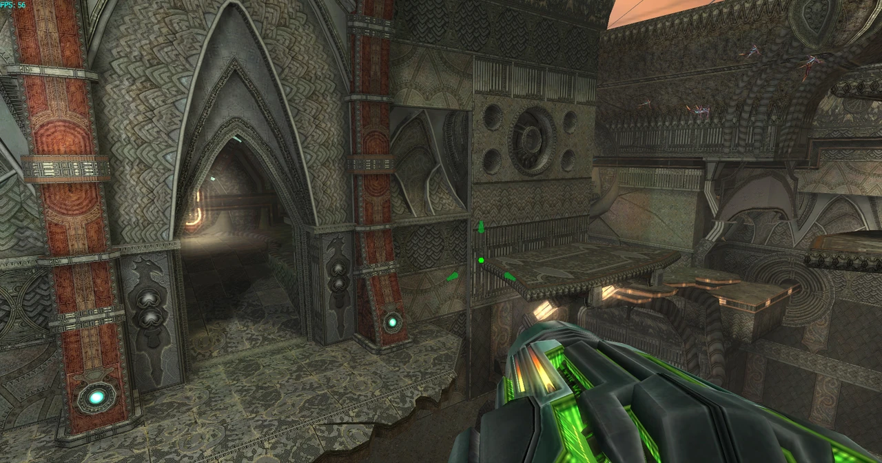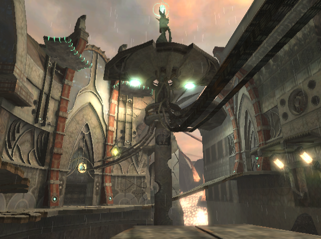 The Gateway is essentially the meeting of three buildings with protruding ledges. Below the Gateway is a large drop. Much of the architecture in the room is aged and decrepit. A solar-energy collector in the center has two sets of metal poles protruding from it twisted into the shape of tunnels. These tunnels lead to the various ledges, and end with a Bomb Slot. Powering these will cause one basin in each tunnel containing Fuel Gel to tip into a downwards position and cause the substance to flow through tram lines on the ledge below. This will turn a circular emblem in the ledge. When both have been activated, the gate at the far end of the Gateway will open.