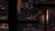 Under the wide platform is another, smaller ledge with two short staircases extending to its top in the background, and a central platform connected to the floor. These, again, cannot be used in gameplay. Present in background of the lowest floor are multiple Chozo works of art, including busts, displayed shields with spears in an X formation, and three Chozo Soldier statues standing tall with their spears in front of them.