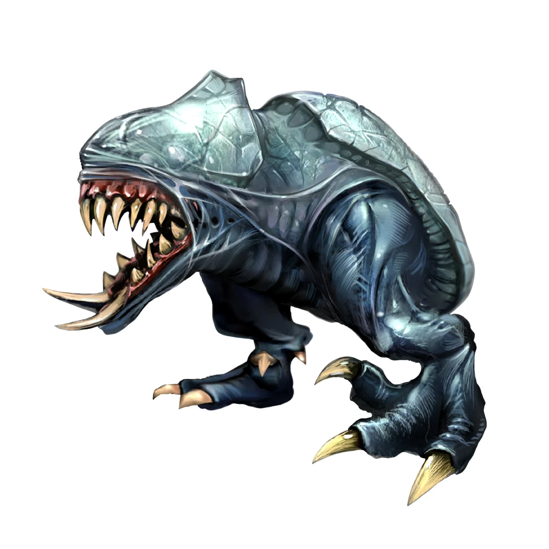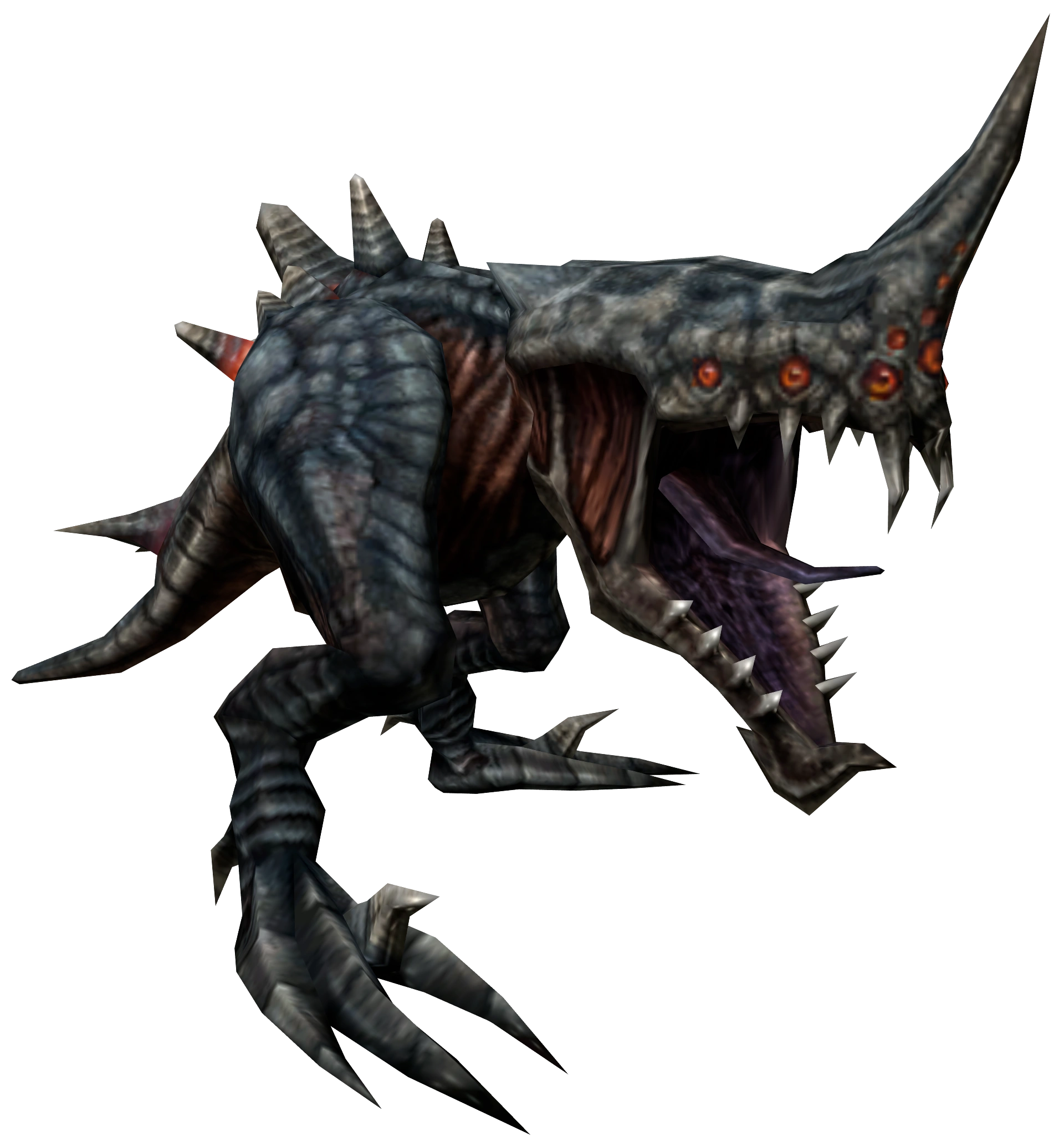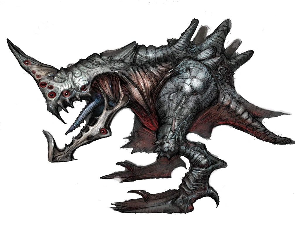 Grenchlers are large, reptilian carnivores with multiple red, beady eyes and massive jaws. In close-quarters combat, a Grenchler can use its sharp teeth to easily tear apart prey and enemy alike. For distant enemies, the Grenchler can also use its single horn to release directed bolts of electrical energy. Its powerful legs can also help it easily close any distance, either by running, swimming, or leaping to impressive heights. Most of the Grenchler’s body is protected by thick, grey plates, which are impervious to all known weaponry; its tail is its only known weak point. While Grenchlers can survive the destruction of their tails, this renders the vulnerable tissue of their hindquarters exposed.