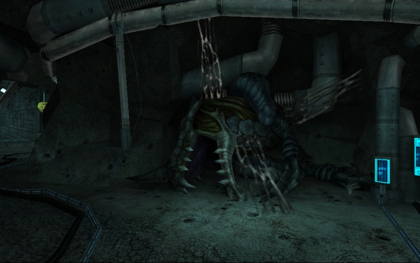 While only encountered alive in the Torvus Bog, three Grenchler carcasses can be seen in the Splinter Hive in the Temple Grounds. 242 shots from Galactic Federation high-energy weaponry were required to bring one down, while another one was electrocuted on exposed wires, and a third one was killed in a power cell explosion. Curiously, all three specimens are larger than those encountered in the Torvus Bog.