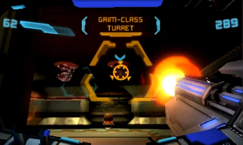 Grim-Class Turrets are security turrets in Metroid Prime: Federation Force. They are found on Excelcion, in the power station on Talvania, and on the Doomseye. Unlike turrets in previous games of the Prime series, Grim-Class Turrets can attach to the floor in addition to the ceiling. They are spawned by the Generator as a defense mechanism.