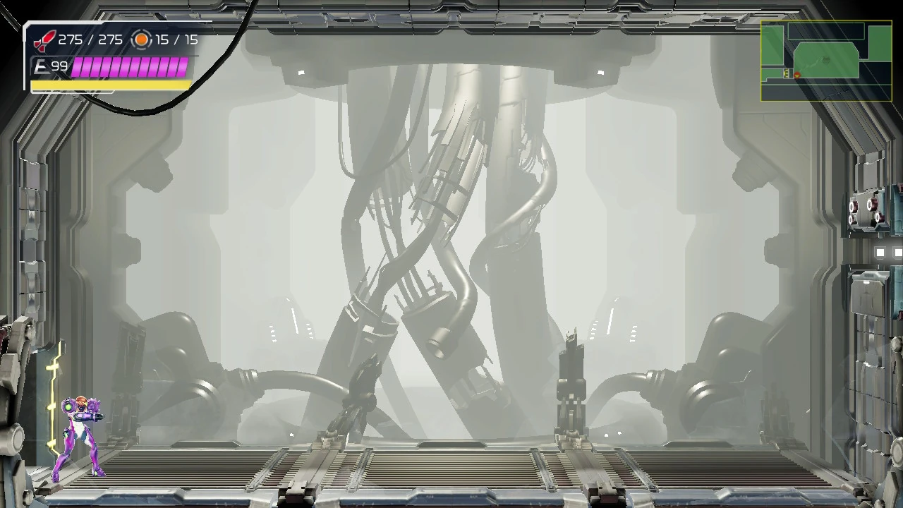 The "Hall of Judgment" is a small chamber adjacent to the E.M.M.I. Zone's entrance. Initially, it is an enclosed space within a glass tube, similar to that found in the Hanubia elevator shaft. Three large cables connect to a conduit in the ceiling in the background. When entered, the door locks permanently, forcing Samus to go around a long way to get back. As she approaches the right wall, a massive explosion detonates, weakening Samus. This will happen even if Samus has the Phantom Cloak enabled. The explosion destroys the walkway and damages the cables, causing them to fray and hang.