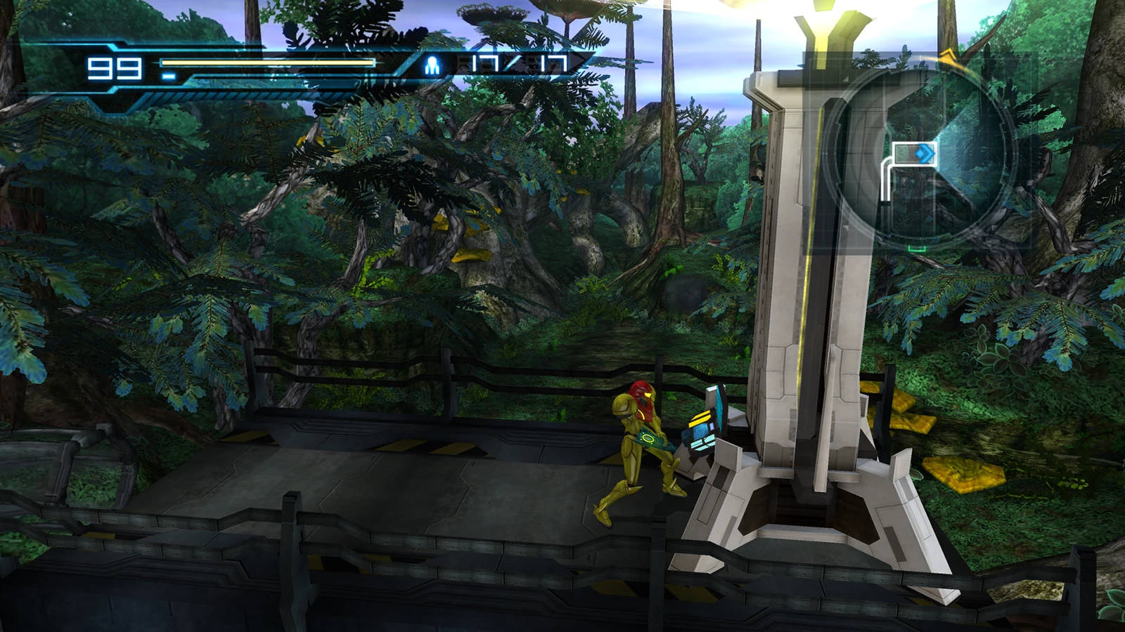 Samus interacts with a "holographic generator" in the jungle environment.