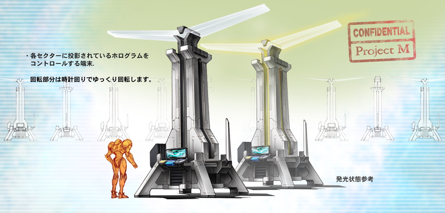 These consoles are capable of producing extremely realistic holographic representations of natural environments onboard the Galactic Federation's BOTTLE SHIP. When active, they are nearly invisible from long distances, as the generator itself is covered in a sort of active camouflage that mimics whatever would be visible behind the device. However, this camouflage deactivates at close range, and for whatever reason does not cover the two yellow windmill-like blades that rotate on top of the device. Holographic generators can be activated or deactivated by means of a small control panel affixed to the front of the device - they are often connected to the room's security devices in such a way that deactivating the generator unlocks a door. For this reason, they are often used to obstruct and/or conceal pathways, forcing Samus to find and disable a generator before she is able to proceed.