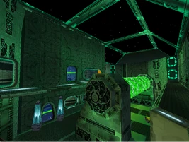 Incubation Vault 03 appears as a stage in the Multiplayer Mode, simply titled Incubation Vault. As with its Adventure Mode counterpart, the Incubation Vault consists of a large structure with two legs and a tube with glowing green material connecting them. This structure is hazardous to Bounty Hunters. The room contains two levels with two corridors each. The top level is accessible by two Jump Pads and a gap on a wall in a corridor. Hunters can jump off of them to access one of the top corridors.