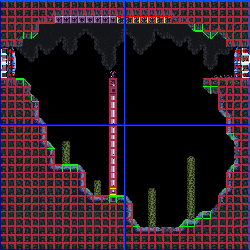 On the left of the room is a Blue Door leading to a room very near the Landing Site. Along the ceiling are many Grapple Points, the last few having the Pit Block characteristic to them. Most of the room is submerged in water, with only the edges of the room, and the column in the center being above it. On the top of the column in the center of the room is a Missile Expansion that is too far to jump towards. On the far right side of the room is another Blue Door. Within the water on the left side are steps leading back up to the left door, and there is a Bomb Block at the bottom of the column for use if Samus falls on the right side of it. There are no stairs leading to the right side of the room, so the Bomb Block exists so prevent the game from soft-locking, if Samus falls on the right side of it without the Gravity Suit. The right door leads to the flooded cavern.