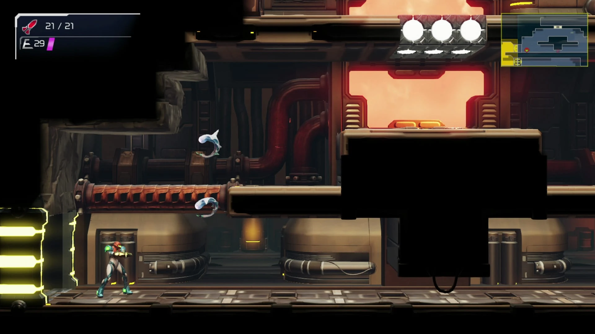 At the base of the room is a large T-shaped structure, with a thin gap that can be slid under; a Missile Tank is present here. To the right is a Thermal Door, which cannot be opened without routing thermal energy to it through a nearby machine. Above the structure is a thin ceiling that partially consists of Beam Blocks. Shooting these opens up a passageway above, at the end of which is a narrow passage in the wall. This leads into a slope in the next room, making it a one-way exit. Samus can get back into this room once she re-routes energy to the Thermal Door.