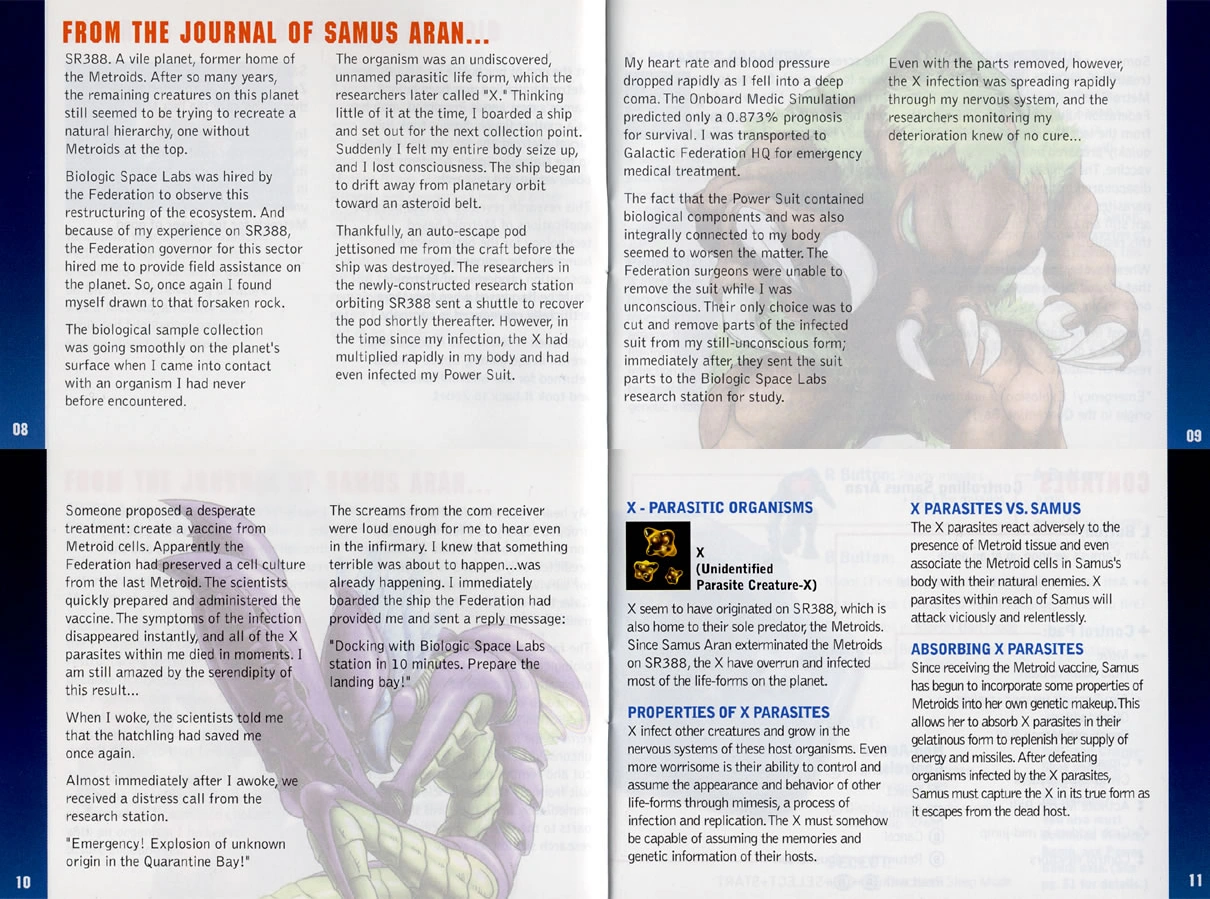 The Metroid Fusion manual features the Journal of Samus Aran, a diary in which she details the events at the beginning of the game.