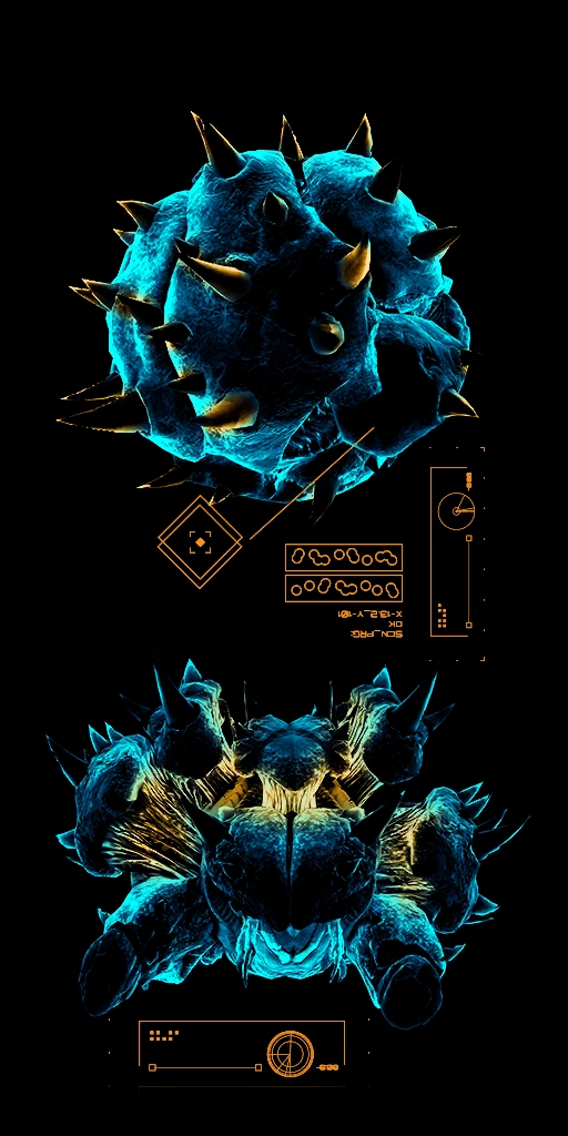 If the sensory organs behind the shell are significantly harmed, Keratos is known to enter an agitated state. It will curl into a ball, spin, and launch itself at its attacker. Fusion with a Metroid has also altered its body, completely exposing its abdominal core.