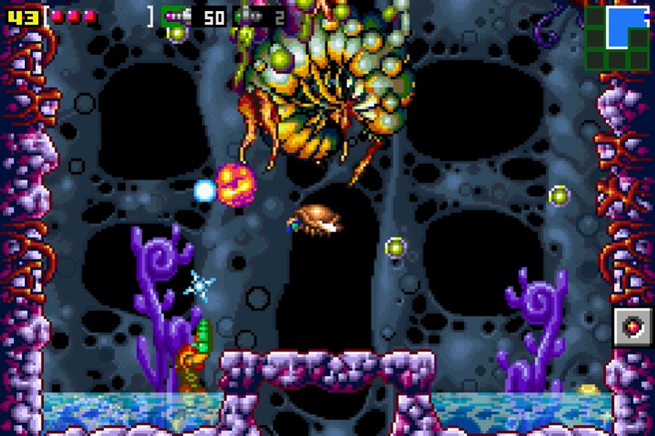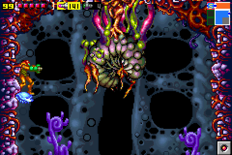 - "A giant larva hangs from the ceiling by beefy vines. You can hit the vines by running to the left or right side of the room, jumping straight up and releasing upward-angled missiles or charged beam shots. You can also get an angle on the vines by freezing the small armored creature that flies around the room and using it as a platform. When your platform begins to thaw, hop up and fire straight down to freeze it again."