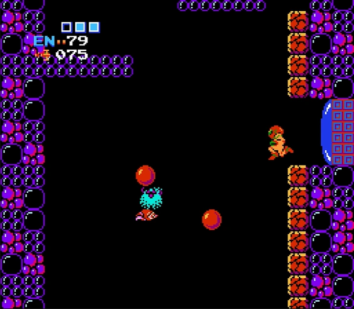 In Metroid, this room is a simple shaft with a purple bubble construction, not unlike other rooms in Norfair. There are two ledges present in the left wall, and four midair platforms resembling red spheres. These can be shot, and will regenerate after some time, akin to Fake Blocks. In addition, the right wall is lined with segmented, orange Fake Blocks. The primary reason to enter this room is to reach the elevator to Ridley's Lair.