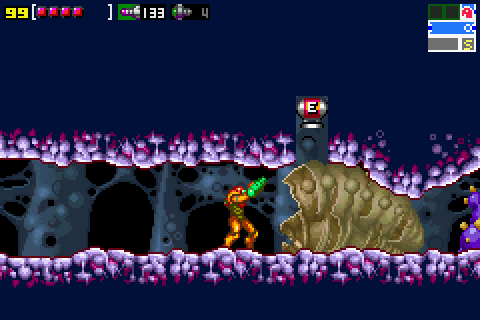 - "A giant larva sits atop a natural rock bridge. Work your way under the bridge and fire straight up, at the beast's belly, through the rock formation. After the creature is gone, use your Hi-Jump ability to hop up, in ball form, to the creature's shell, then roll on to the right."