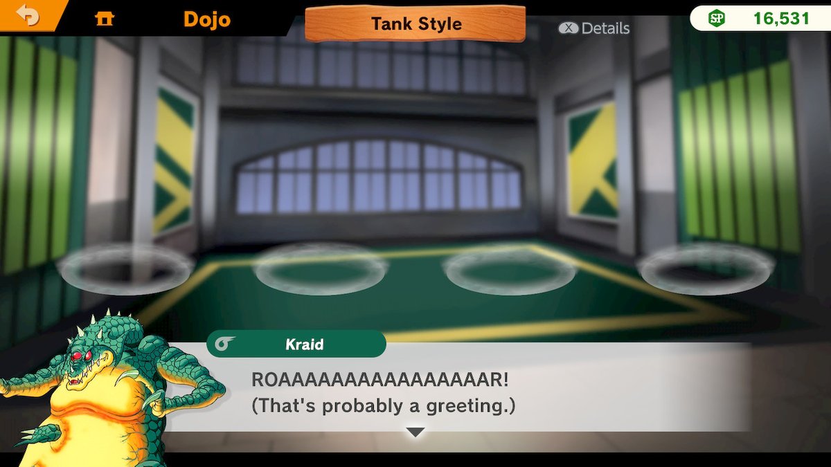 Once unlocked, Kraid runs a Dojo, where he trains up to four other Spirits. He teaches them the Tank Style, which increases offense and defense but reduces move speed and jump. As a Master Spirit, Kraid is given dialogue for the first time in a videogame; however, it consists entirely of roars and grunts. Translations are provided in parentheses, although these translations seem to be somewhat uncertain (often guessing what Kraid means or ending with question marks) for added humor. On a similar note, this technically marks the first time that Kraid acts as an ally to the player rather than an enemy.