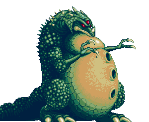 "A boss enemy from Metroid. Kraid lives in the depths of Brinstar. He immobilizes enemies with his three red eyes, and his powerful jaws can crush anything. He can also shoot the three spikes in his belly; it's said he often fires them at his prey. Once Samus defeated Ridley and Kraid, the way to Tourian opened."