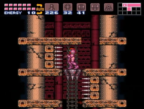Present in the Wrecked Ship and Ridley's Hideout, the Kzan is a grey platform with three spikes underneath it, serving as both a hazard and a helpful object.