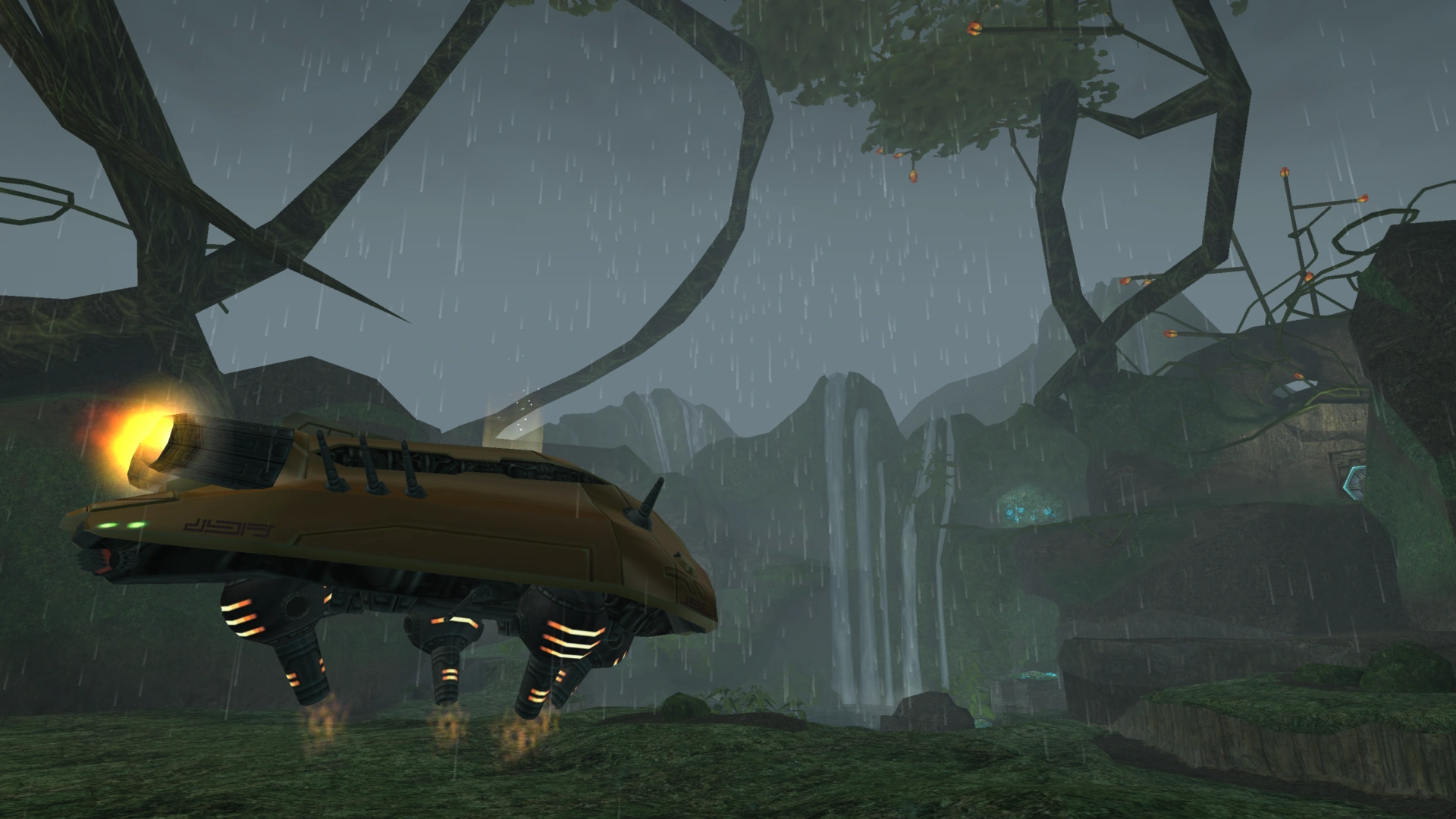 This is the first place visited on Tallon IV, where Samus Aran's Gunship lands and remains for the duration of the game. It is raining here, and the room is open to the sky and contains a small waterfall and pond to the southeast. Ledges around the waterfall allow access to the Temple Hall door. There are higher platforms behind the gunship that cannot be reached from this room in normal play before the Space Jump Boots are collected. The Waterfall Cavern can be reached through a short dry slope, partially hidden by rock, near the pool.