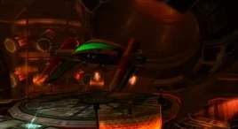 The room is fairly large, and of circular shape. The room is comprised of scarlet and red tones. The Landing Pad is located in the centre of the room and is also circular. North of the Landing Pad is a narrow bridge-like platform leading to the next room. On the walls, Tanks storing of a type of fuel or substance can be seen locked into racks as well as pipes and wires lead around the room. A large hatch allows ships to enter and exit the Landing Site and reach other locations on the Homeworld.