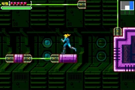 Samus first comes to this room after having lost her Power Suit and Starship. To safely navigate this room without triggering any alarms, she must carefully navigate the platforms and even Wall Jump along some of the longer platforms if possible. One wall structure is found directly above a crumbling platform (pictured right), and must be quickly crawled under before Samus falls through into a laser. If a laser is tripped, all lasers in the room will disappear and the alarm will activate. Four Zebesians enter this room if Samus is detected. To lose them, Samus can run into the next room and hide on a ledge above the door, then wait for a Zebesian that comes in to leave.
