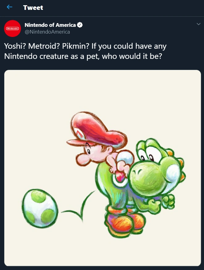"Yoshi? Metroid? Pikmin? If you could have any Nintendo creature as a pet, who would it be?"[2]