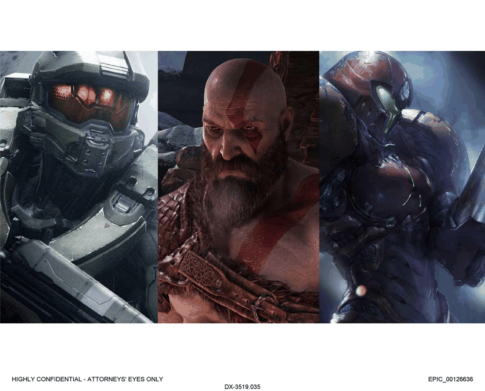 Artwork of Samus Aran appears in an internal Epic Games quarterly business review from June 2020, implying she was at one point considered for a playable skin in Fortnite. The document was released as part of the Epic v. Apple trial in May 2021. Page 34 of the presentation includes an unofficial Samus art piece (from Daryl Braun) next to Master Chief and Kratos, who eventually did come to Fortnite.[33][34]