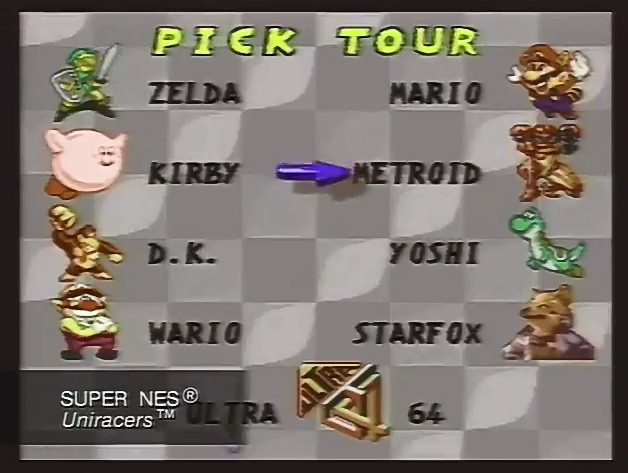 In early promotional footage, the finalized course tour names are replaced by the Nintendo game series and character icons. One is "METROID", with a kneeling mirrored image of Samus Aran. [12] This became the Bounder (kangaroo) tour in the retail game.