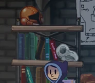 Samus' helmet and red clothing are seen in a locker within the women's locker room at Volks Corporation. A Nintendo GameCube can also be seen in a different locker.