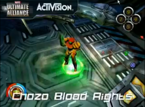 The game was intended to include Samus and Link as playable characters, but Nintendo ultimately refused to license them for Activision. A video shows Samus using many of her abilities from the Metroid series, and she appears to have been based on her Metroid Prime depiction. She is also seen using a new ability called Chozo Blood Rights. The appearance of this ability is short, and there does not appear to be any visible changes after activation, apart from a green glow around Samus. It would seem to increase benefits inherited from the Chozo blood Samus has. This ability might have granted Samus more power or better defense, as it does not appear to be an attacking move.