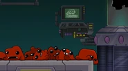 The cutscene before The Lab chapter parodies the iconic Title Screen cutscene in Super Metroid. In place of the baby, Meat Boy is contained in the stasis tank, appearing to be asleep, with multiple dead Meat Boys littering the floor. The camera pans across the bodies and stasis tank in the same manner as the Super Metroid scene, interspersed with text saying "TEAM MEAT" "PRESENTS" "SUPER MEAT BOY 2", similar to "Nintendo Presents Metroid 3". There are more bodies in the Meat Boy version than the original Super Metroid scene. The music in the scene pays homage to Opening (Destroyed Science Academy Research Station), the into theme of Super Metroid.