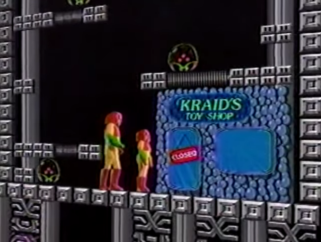 In a Toys R Us commercial that advertised NES games, a store in Tourian, labeled Kraid's Toy Shop, is shown to be sold out. A man and his son are seen there wearing Samus Aran's Power Suit as they bomb the floor into Toys Я Us.
