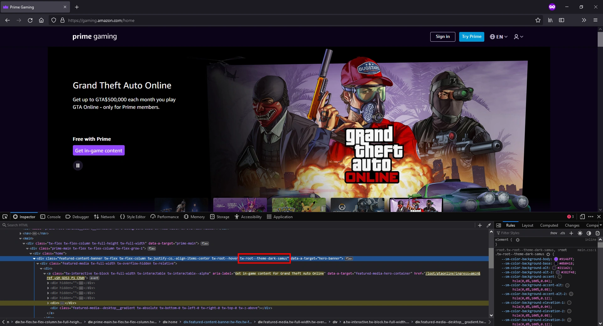 The Prime Gaming website uses a CSS theme called "dark-samus".